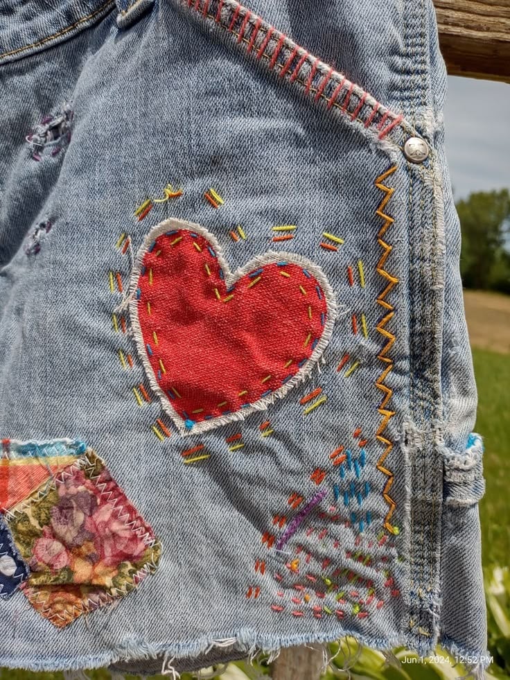 Embroidered patchwork blends repair with decoration, turning imperfections into features. Colorful stitching, heart-shaped patches, and layered fabric pieces create a handcrafted look that feels personal and artistic. This style highlights the beauty of visible mending — where every stitch becomes part of the design rather than something to hide.